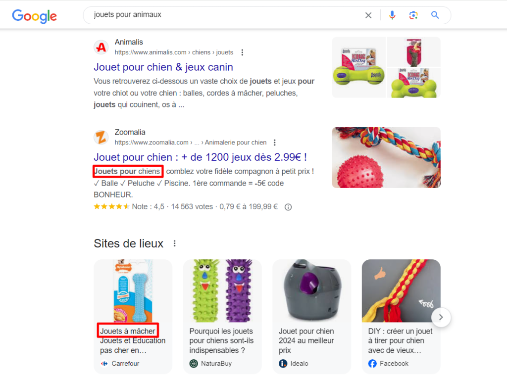 Recherchez votre mot clé principal sur le moteur de recherche et vous trouverez d’autres termes connexes dans les résultats. Par exemple, si vous cherchez « jouets pour animaux », vous verrez d’autres mots-clés, tels que jouets pour chiens et jouets à mâcher.