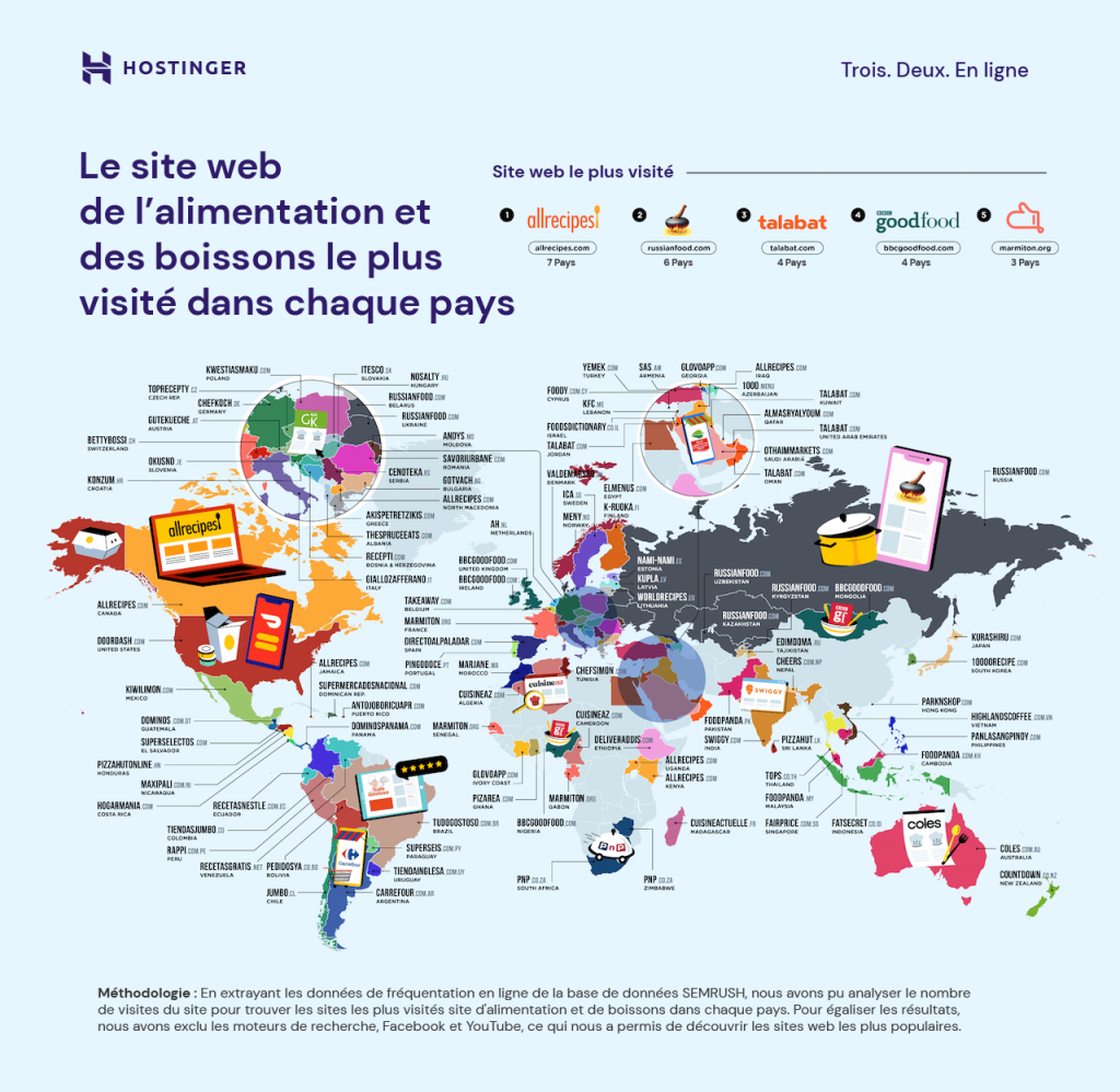 Hostinger souhaite vous aider à créer un site Web que votre public de rêve souhaite visiter. C’est pourquoi nous avons identifié et cartographié le site Web le plus visité dans chaque pays du monde, ainsi que les principaux sites Web d’actualités, de banque, de mode et d’alimentation dans chaque région.