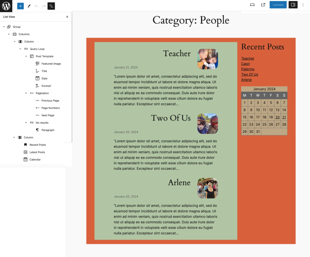 Je suis parti de zéro dans l’éditeur de site et j’ai créé une présentation en deux colonnes enveloppée dans un bloc de groupe. La colonne de gauche contient le bloc d’apparence de la requête très important, qui attire un contenu dynamique en fonction de la façon dont la composition est utilisée.