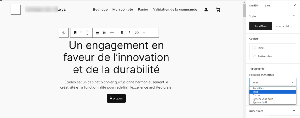 Comme c’est le cas depuis l’adoption du système de blocs Gutenberg, les polices peuvent être définies pour l’ensemble du site ou pour chaque bloc.