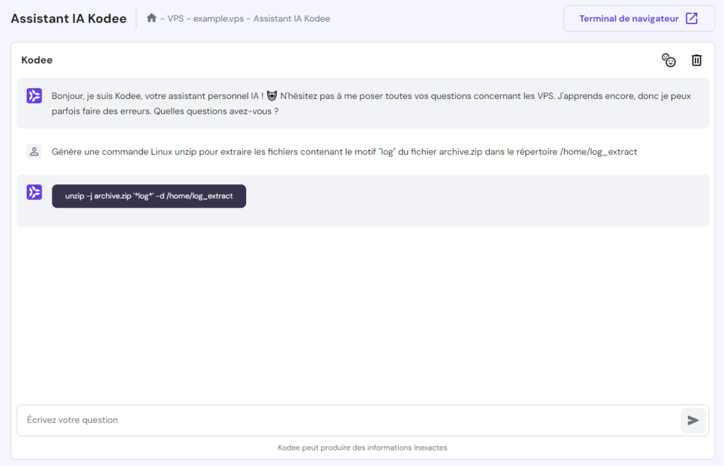 Avec l’hébergement VPS d’Hostinger, vous pouvez utiliser notre assistant IA, Kodee pour générer facilement des commandes unzip et des scripts bash à l’aide de simples invites. Ils peuvent ensuite copier-coller la sortie pour économiser du temps et des efforts.