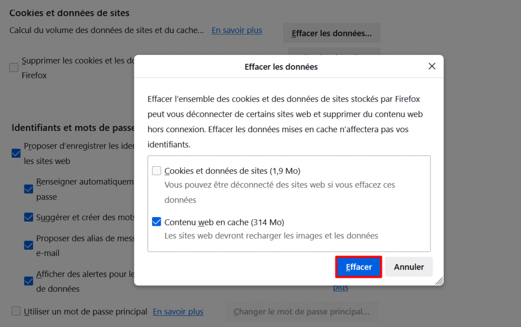 6. Cliquez sur le bouton Effacer pour supprimer le cache de Firefox.