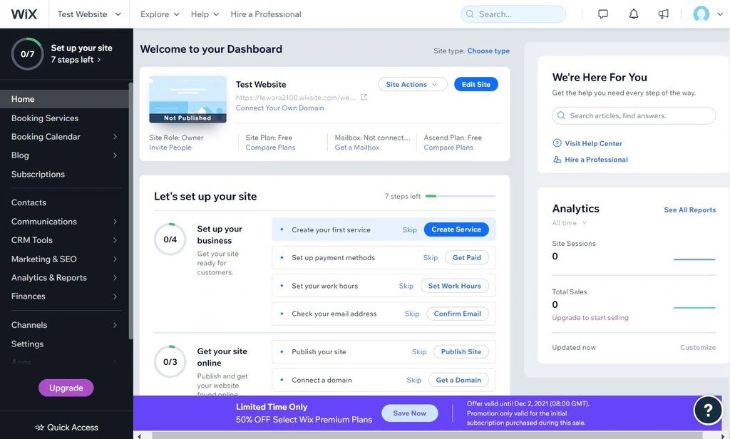 Vous aurez tout ce dont vous avez besoin pour gérer votre site web dans votre tableau de bord Wix. Ici, vous pouvez accéder à des outils de marketing et de SEO, à des flux de travail et à des rapports d’analyse.