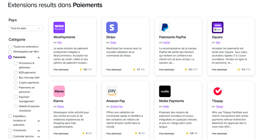 WooPayments est une option viable si vous ne souhaitez pas utiliser d’extensions tierces pour gérer les paiements. Ses frais de traitement sont comparables à ceux de la plupart de ses concurrents. Vous devrez ouvrir un compte pour l’utiliser avec WooCommerce. Vous pouvez également utiliser des extensions pour intégrer d’autres passerelles de paiement à WooCommerce. Il existe une extension WooCommerce pour presque toutes les options de paiement. La plupart d’entre elles sont gratuites, bien que vous deviez toujours payer des frais de traitement