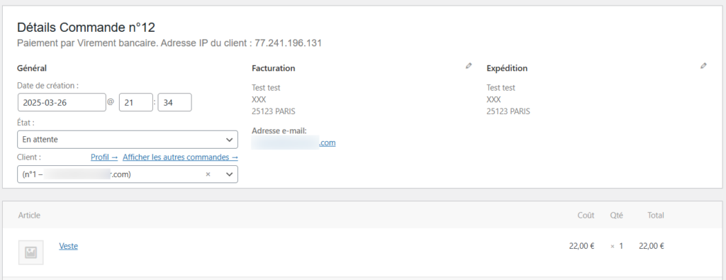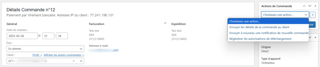 Notez que certaines options de gestion des commandes ne sont pas disponibles pour les achats effectués en tant qu’invité. Par exemple, si vous souhaitez renvoyer une facture par courrier électronique, vous devrez disposer de l’adresse du client dans vos dossiers.