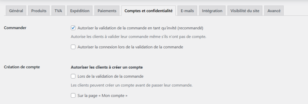En ce qui concerne la confidentialité, WooCommerce ne stocke pas les informations de paiement des clients, car il s’appuie sur des processeurs de paiement externes. Vous pouvez choisir d’activer l’option de paiement en mode invité si vous souhaitez éviter d’obliger les utilisateurs à s’enregistrer et à partager leurs informations personnelles.