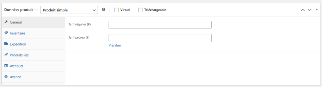 WooCommerce ajoute également un widget avancé de données produit à l’éditeur. C’est là que vous passerez probablement le plus de temps à rédiger des produits. Pour chaque article, vous pouvez définir le prix, la configuration des taxes, les options d’expédition, les attributs, etc.