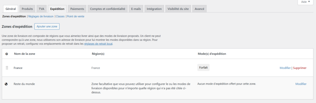 Lorsqu’un client effectue un achat, il voit les options d’expédition disponibles pour sa région. Vous pouvez configurer différentes méthodes d’expédition pour chaque région et définir leurs coûts.