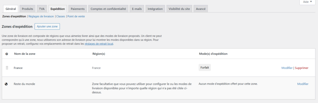 Tout comme pour les taxes, WooCommerce ne gère pas les frais de port pour vous. Vous devez les configurer manuellement ou faire appel à un prestataire de services. Une fois les options d’expédition configurées, utilisez WooCommerce pour les intégrer à votre boutique en ligne.