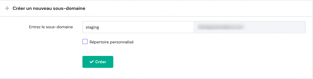 - Saisissez le nom du sous-domaine pour le site de staging et cliquez sur Créer.
