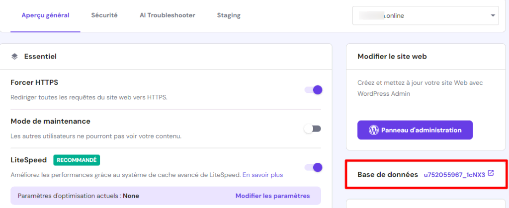 - Naviguez vers WordPress → Aperçu général depuis le hPanel, et vérifiez quelle base de données votre site principal utilise.