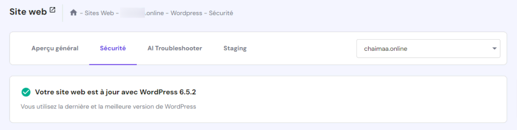 Si vous souhaitez vérifier votre version de WordPress, allez dans WordPress → Sécurité à partir de hPanel. Notez que l’emplacement de ces informations varie en fonction de votre hébergeur.