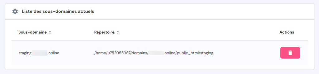 - Accédez à la liste des sous-domaines actuels via Noms de domaine → Sous-domaines. Sélectionnez l’icône Supprimer à côté du sous-domaine de staging que vous n’utilisez plus. Lisez la clause de non-responsabilité et cliquez sur Supprimer pour confirmer.