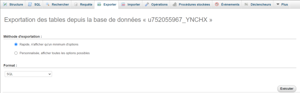 - Exportez la base de données de votre site de staging via Bases de données → phpMyAdmin.