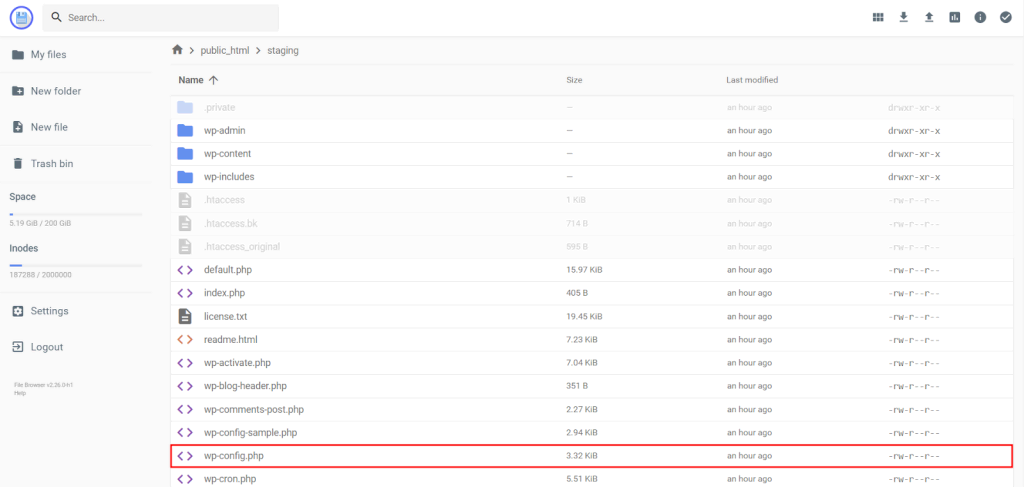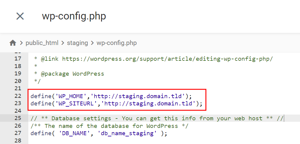 - Dans le gestionnaire de fichiers, ouvrez public_html → staging → wp-config.php.