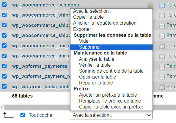 Puisque vous ne pouvez importer que dans une base de données vide, effacez d’abord la base de données du site d’origine. Après avoir sauvegardé la base de données du site original à l’aide de la fonction d’exportation de phpMyAdmin, suivez ces étapes :