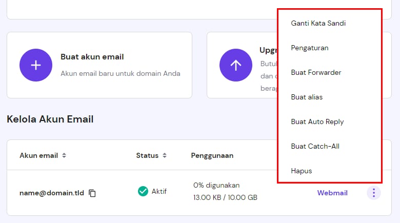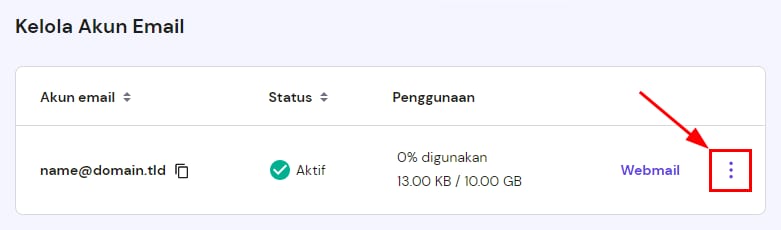 Di Akun Email, Anda bisa menemukan semua informasi umum tentang penggunaan akun email, tombol login ke Webmail, dan ikon ⋮ untuk menampilkan Opsi lain: