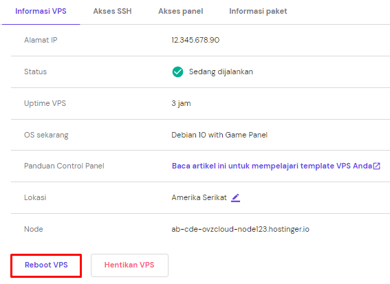 User Hostinger bisa melakukannya dengan mengakses halaman Pengelolaan Server dan mengklik tombol Reboot.