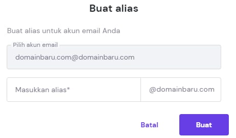 Untuk membuat email alias, buka menu Email → pilih nama domain → Email Alias dan klik Buat Alias: