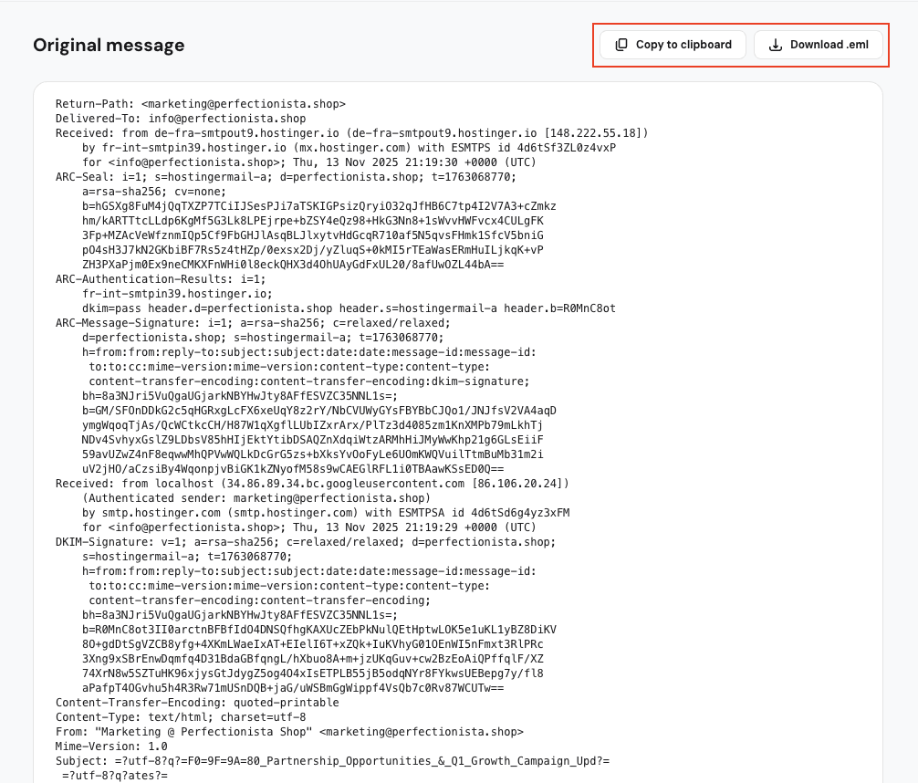 Di artikel ini, Anda akan menemukan cara membuka sumber email dan melihat email header di Hostinger Mail, termasuk cara menyalinnya dan mengunduh file lengkap .eml.
