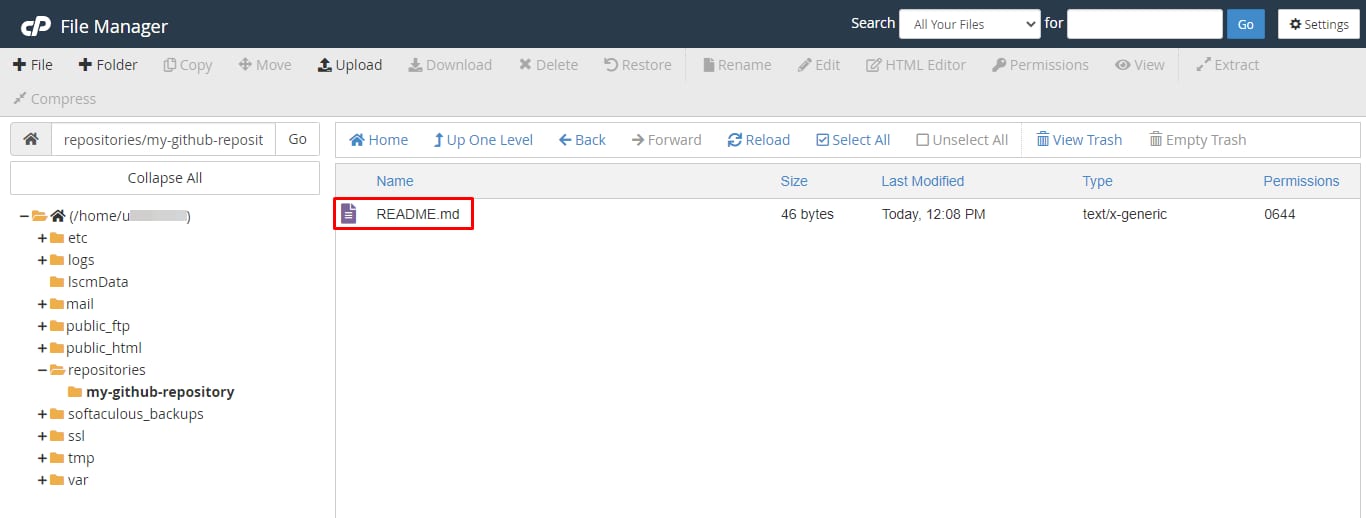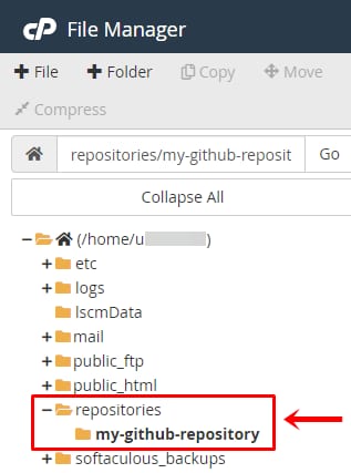 2. Anda akan diarahkan ke halaman File Manager. Silakan masuk ke direktori dari Clone Repository berdasarkan Repository Path. Sebagai contoh, kami menggunakan contoh path repositories/my-github-repository.