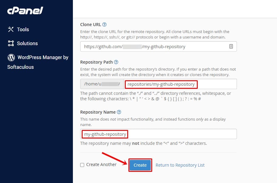 4. Klik area lain di luar kolom agar kolom Repository Path dan Repository Name terisi otomatis. Untuk membuat Clone Repository, klik tombol Create.