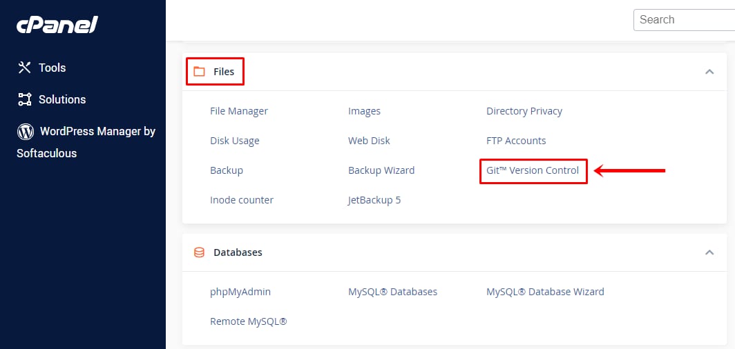 1. Pada halaman cPanel, silakan gulir ke bagian Files dan pilih menu Git™ Version Control.