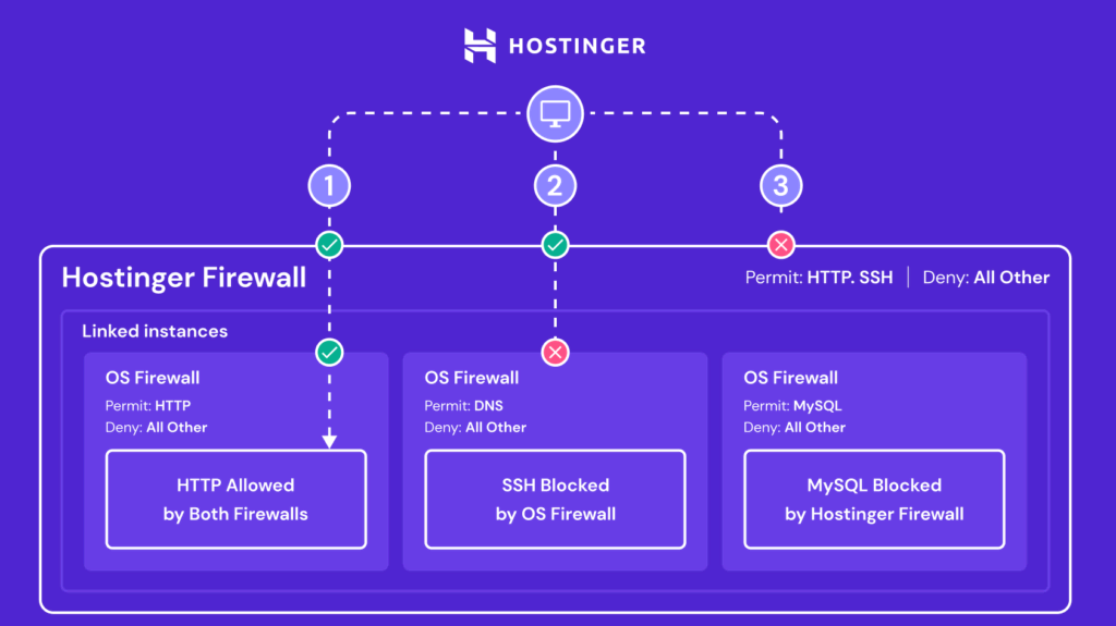 Firewall VPS Hostinger bekerja dengan memblokir traffic yang tidak sah sebelum mencapai server, sekaligus menyediakan konfigurasi yang mudah dari satu dashboard sehingga Anda bisa mengelola aturan keamanan server tanpa perlu repot.