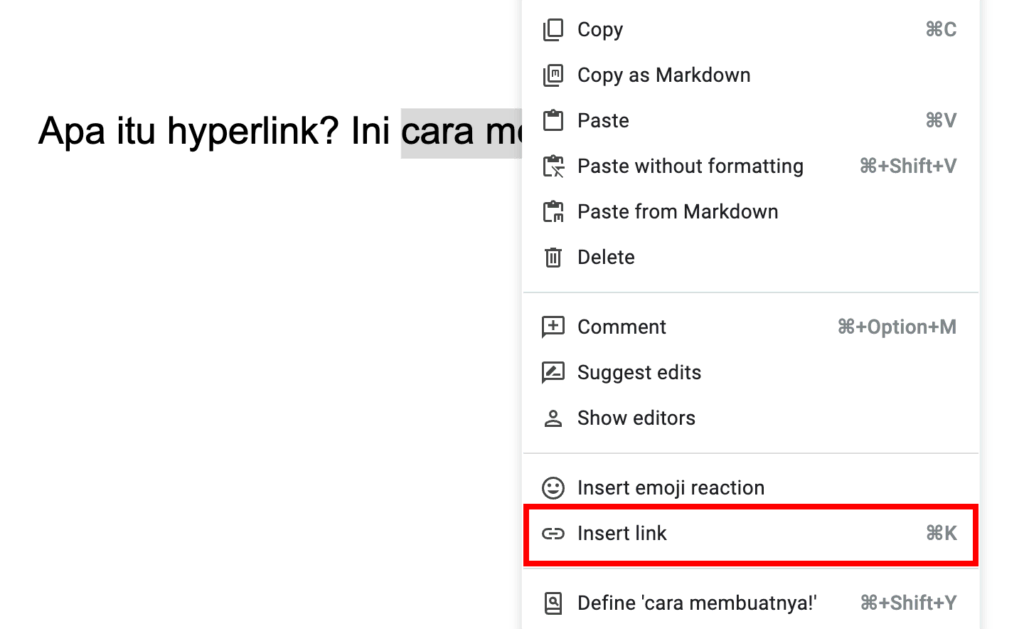 Cukup pilih teks atau gambar yang ingin diberi hyperlink, lalu klik opsi Link atau Insert link. Setelah itu, masukkan URL atau lokasi file yang ingin ditautkan.