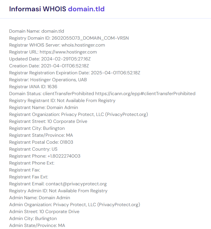 Hostinger sendiri menyediakan tool WHOIS Lookup yang bisa Anda gunakan secara gratis. Cukup masukkan alamat website yang ingin Anda lihat informasinya, kemudian tool ini akan menampilkan pemilik domain saat ini, registrar, dan tanggal berakhirnya.