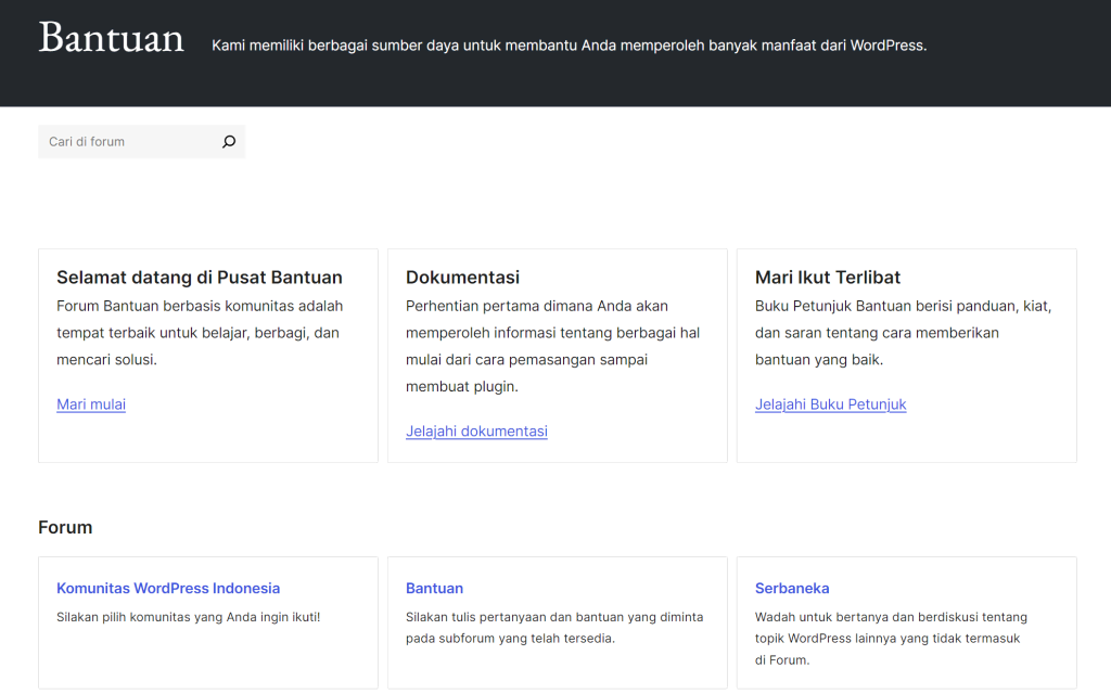 Kemudian, forum WordPress dibagi dalam kategori laporan bug, pengembangan, dan masukan. Selain itu, setiap tema dan plugin memiliki forum sendiri bagi pengguna untuk meminta bantuan penyelesaian masalah website yang terkait dengan tema dan plugin tersebut.
