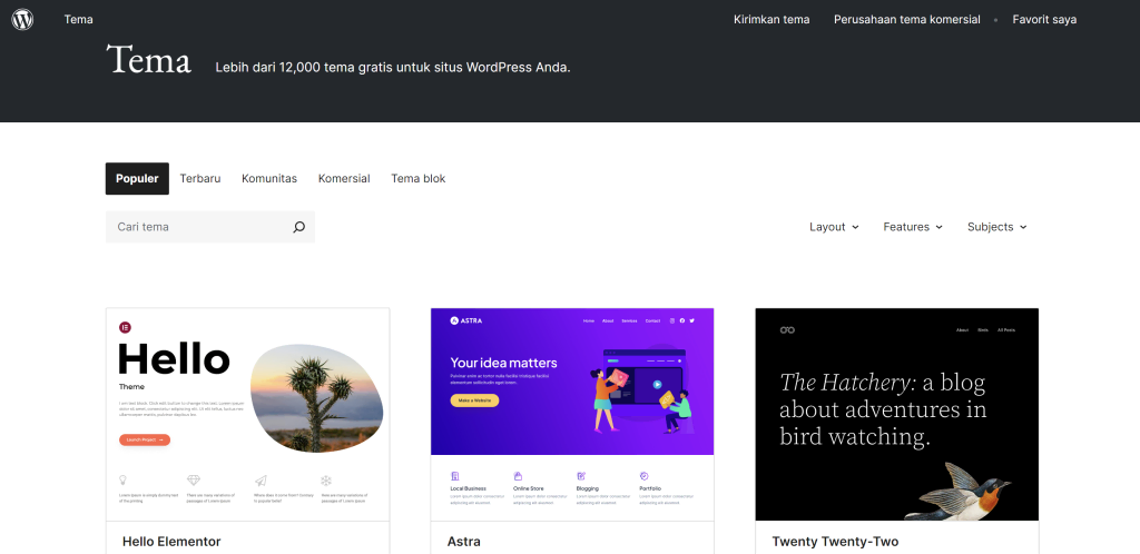 Tema juga menyediakan berbagai fitur untuk membantu Anda mendesain web. Ada lebih dari 8.000 tema dalam direktori WordPress yang bisa Anda pilih. Belum lagi, setiap tema tersebut mungkin menyertakan beberapa template siap pakai.