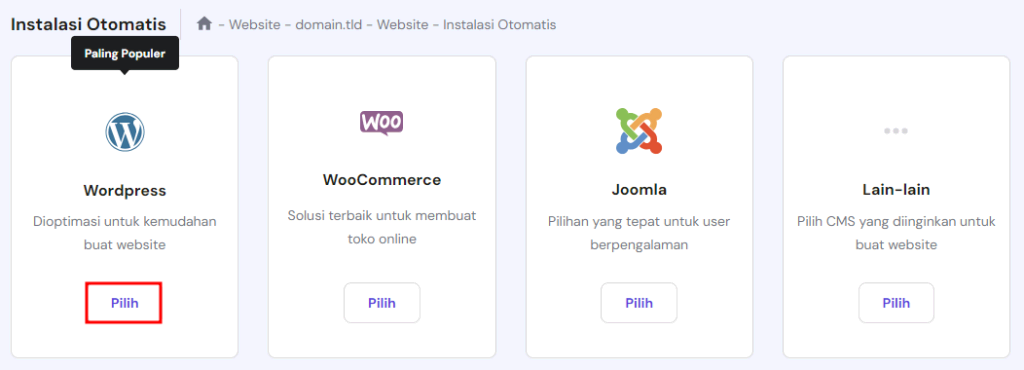 Atau, Anda bisa menginstal WordPress nanti melalui menu Website → Instalasi Otomatis dan memilih WordPress. Kemudian, masukkan kredensial Anda dan pilih versi WordPress yang akan diinstal. Pastikan untuk memilih versi WordPress terbaru yang tersedia.