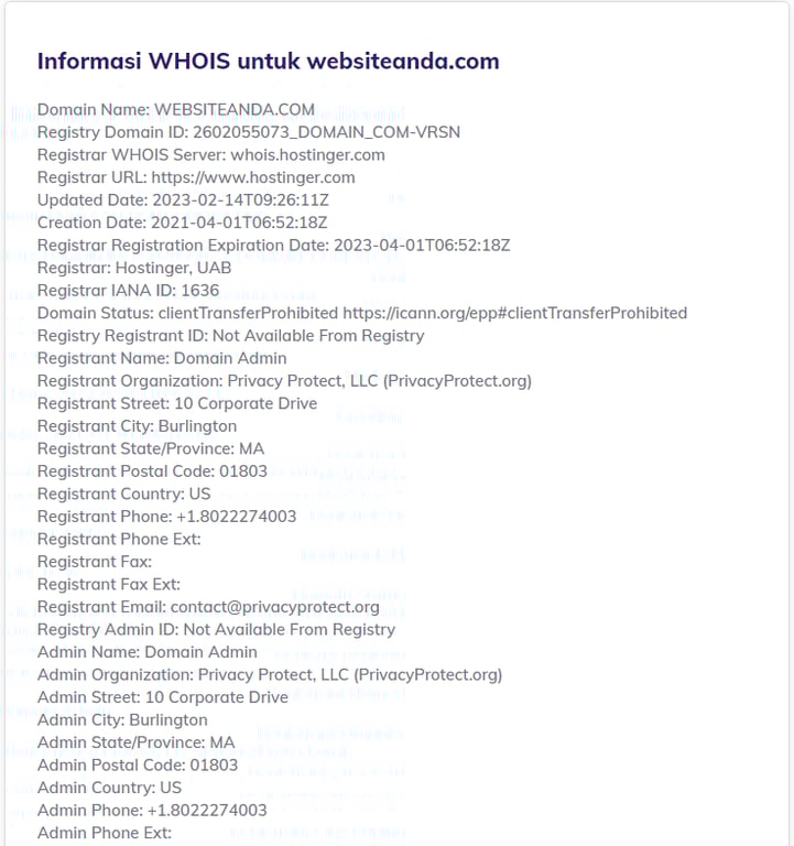 Kemudian, buka tool pencarian WHOIS dan masukkan nama domain Anda untuk mencari tahu apakah detail kontak Anda sudah disembunyikan. Kalau tidak ada informasi pribadi yang muncul, misalnya alamat email Anda, artinya layanan perlindungan privasi domain sudah aktif.