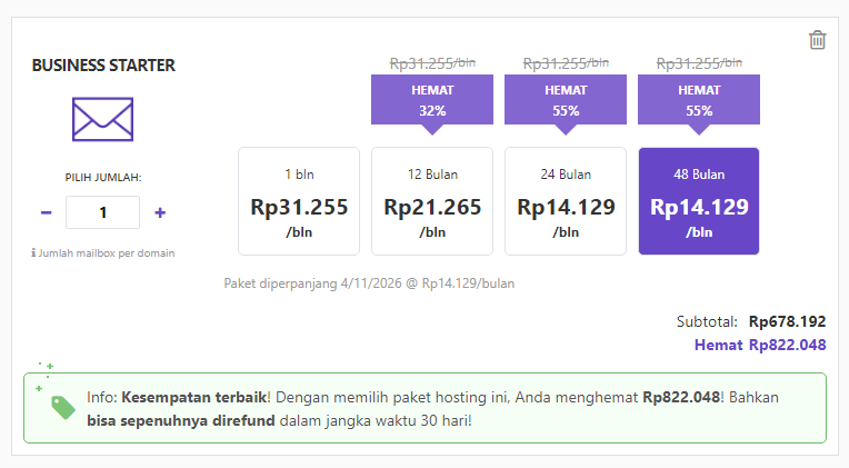 Durasi paket yang dipilih tentu akan mempengaruhi total biaya maintenance website Anda. Misalnya, periode 48 bulan akan dikenakan biaya Rp14.129/bulan, sedangkan untuk periode satu bulan dikenakan biaya Rp31.255/bulan.