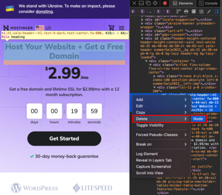 - Kalau Anda ingin menghapus elemen HTML, klik kanan kode yang ditandai dan pilih Delete element (Hapus elemen). Refresh halaman kalau ingin mengembalikan tampilan dari kode yang dihapus.