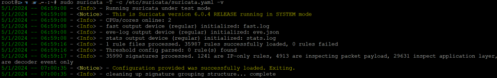 sudo suricata -T -c /etc/suricata/suricata.yaml -v