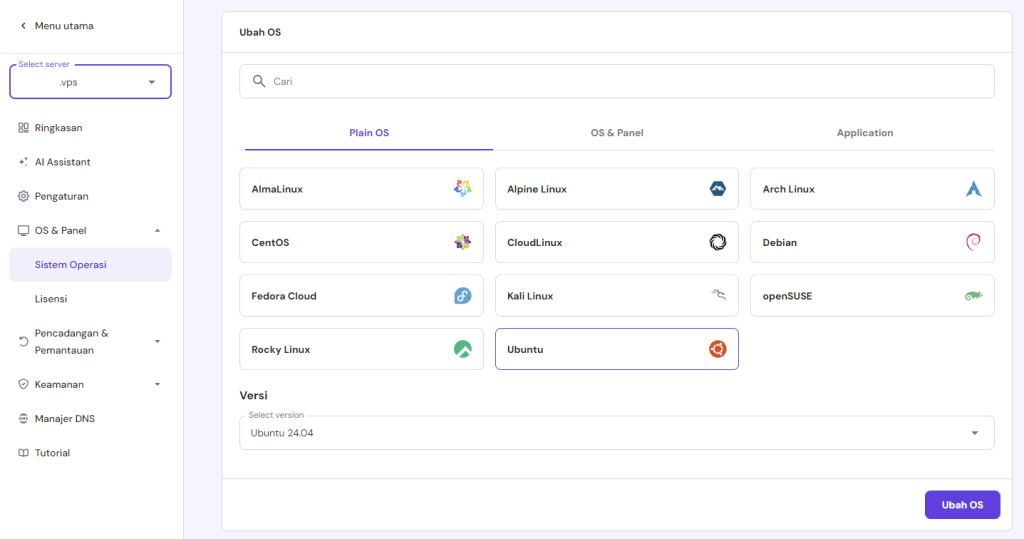 User Hostinger bisa menggunakan one-click installer di hPanel untuk mengganti sistem operasi. Caranya, buka VPS, lalu pilih Kelola di samping paket VPS Anda. Di halaman berikutnya, pilih OS & Panel → Sistem Operasi → Plain OS.