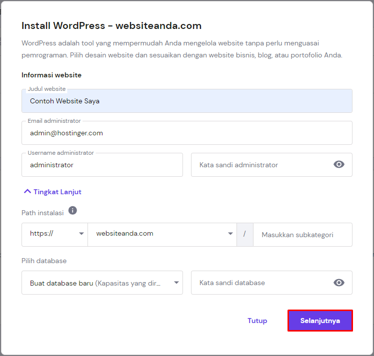 Dalam tutorial ini, kami akan menggunakan Instalasi Otomatis Hostinger untuk menginstal WordPress:
