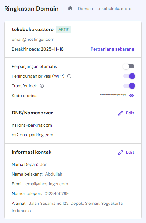 Apabila pembelian berhasil, Anda akan diarahkan ke halaman Informasi domain untuk mengatur berbagai konfigurasi tambahan, seperti DNS record, penerusan domain, hingga perlindungan privasi.