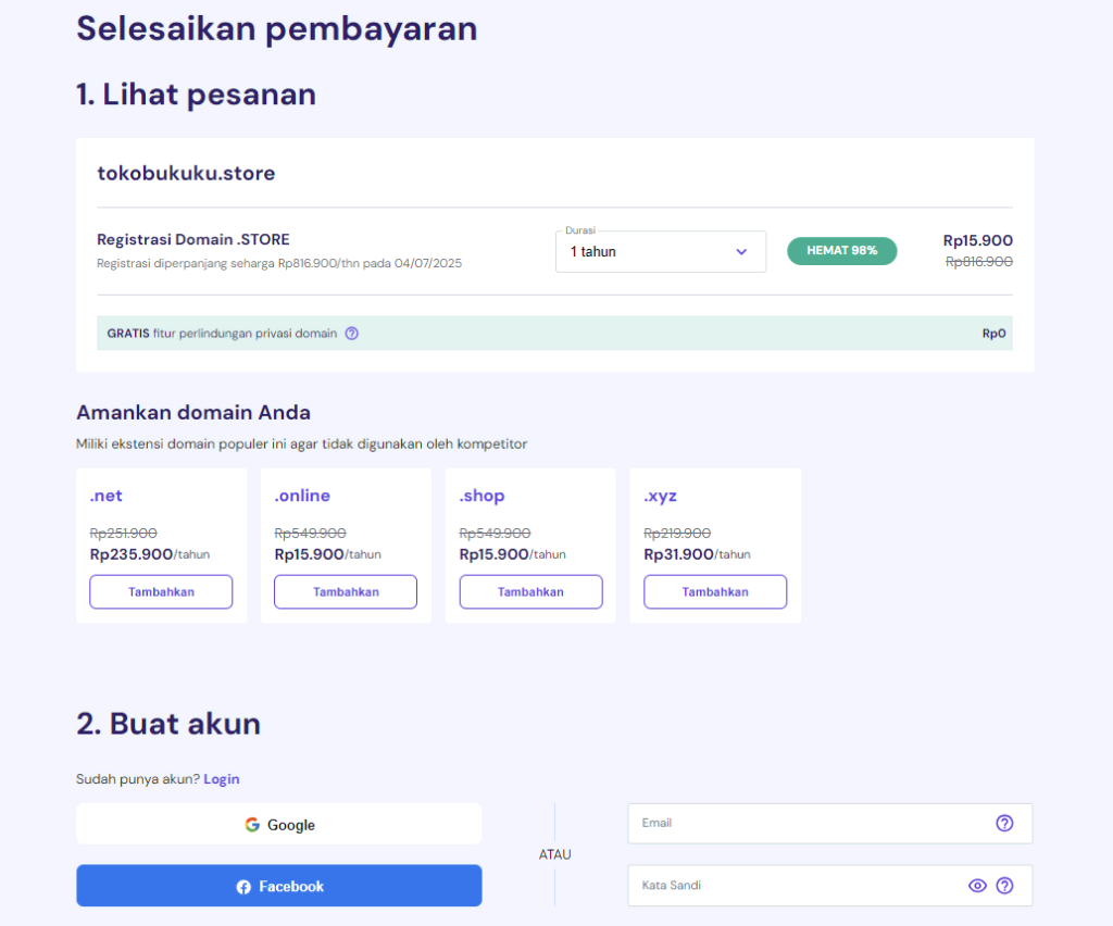 Setelah menemukan domain yang cocok dan tersedia, Anda bisa langsung membelinya.