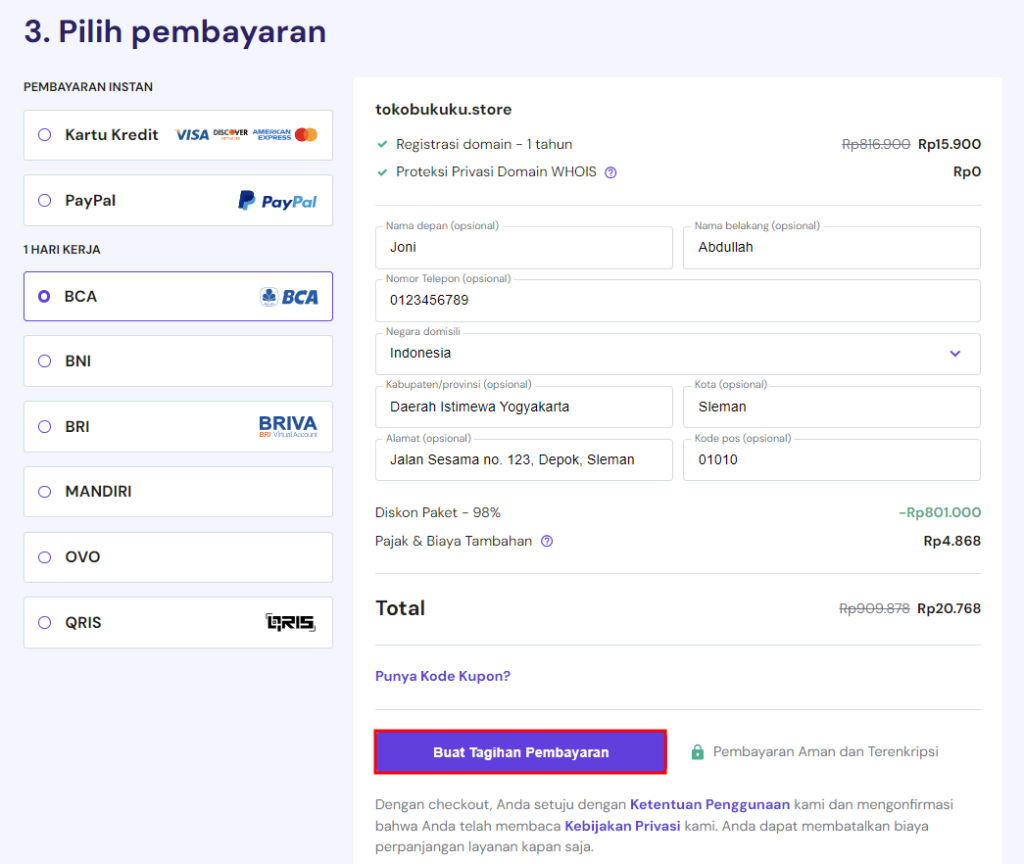 - Masukkan alamat tagihan dan pilih metode pembayaran yang diinginkan, lalu klik Buat tagihan pembayaran.