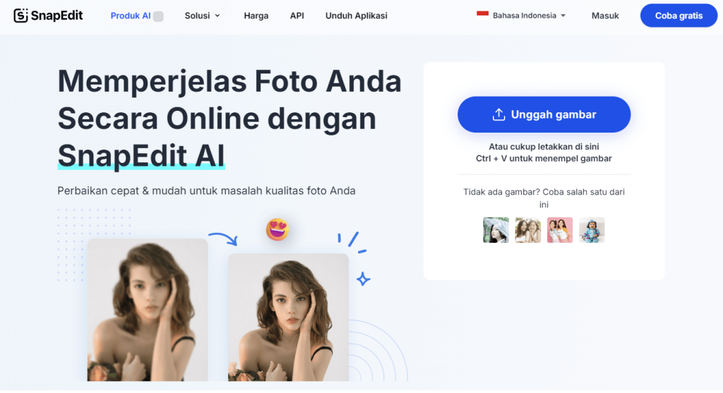 Snapedit adalah tool online yang memanfaatkan AI untuk mengubah foto menjadi HD, menghapus noise, dan meningkatkan resolusi gambar. Tool ini bisa Anda akses dengan mudah melalui web browser tanpa perlu mendaftar akun.
