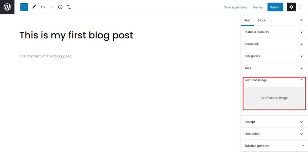 Untuk menambahkan featured image, buka Settings -> Post -> Featured image -> Set featured image. Anda akan diarahkan ke Media Library untuk memilih gambar yang diinginkan.