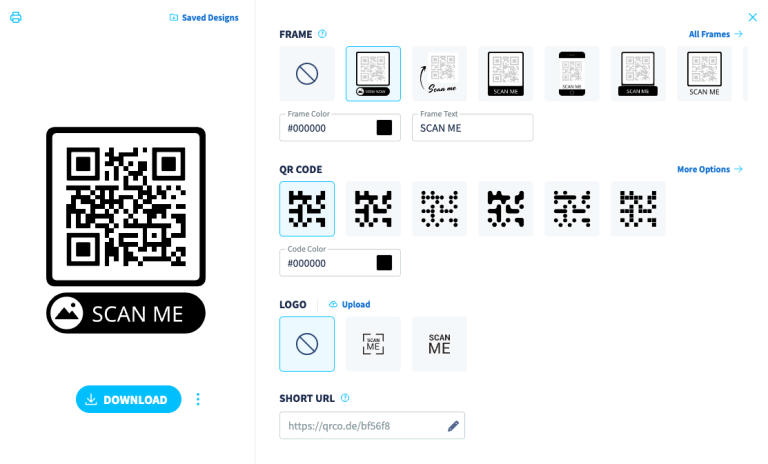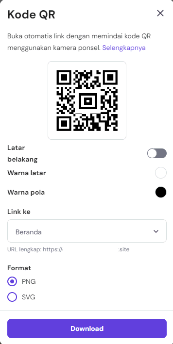 - Klik Download untuk menyimpan QR code dalam format PNG atau SVG. Menggunakan format SVG, tampilan QR code Anda tidak akan pecah atau menurun kualitasnya sehingga cocok untuk materi cetak.
