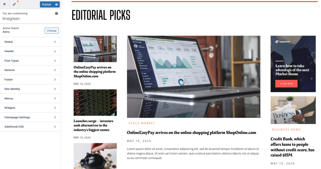Selanjutnya, Anda bisa menyesuaikan tampilan website melalui theme customizer WordPress agar lebih sesuai dengan brand dan cakupan berita Anda. Kalau sudah puas dengan hasilnya, Anda bisa mengklik Publish.