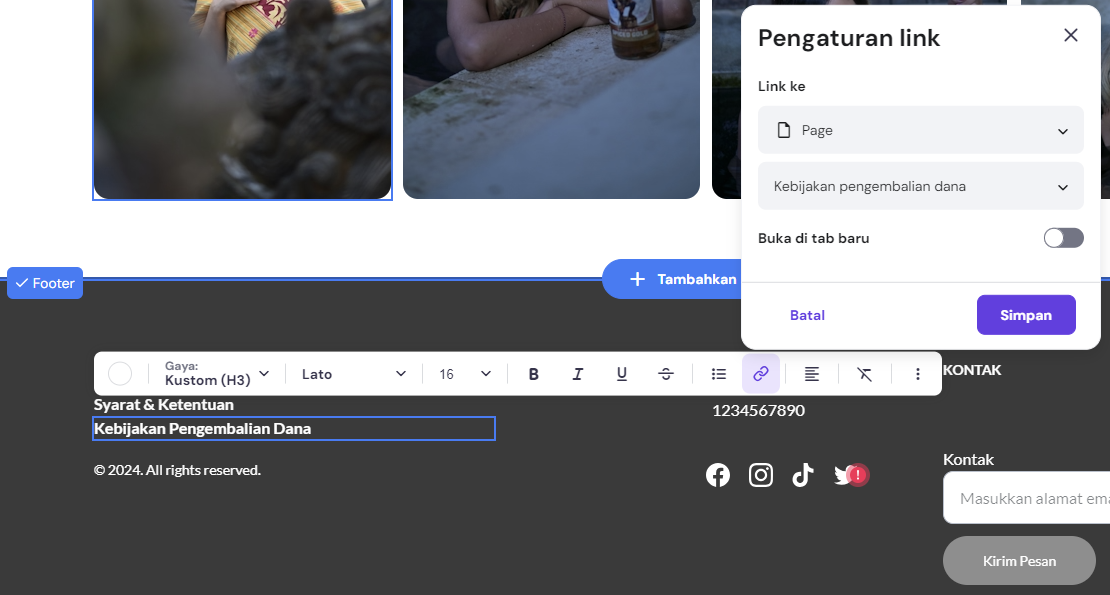 Buat hyperlink dengan mendedit teks footer yang Anda inginkan, lalu klik ikon Link. Pilih halaman yang Anda maksud dari menu drop-down, kemudian klik Simpan.