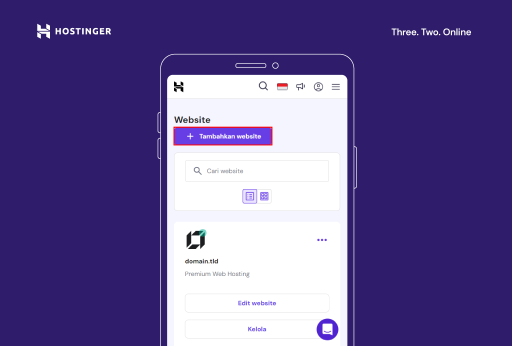 Login ke hPanel, pilih website yang ingin Anda edit, atau pilih untuk membuat website baru dengan Hostinger Website Builder. Anda bisa mengedit website langsung dari browser di berbagai perangkat seluler.