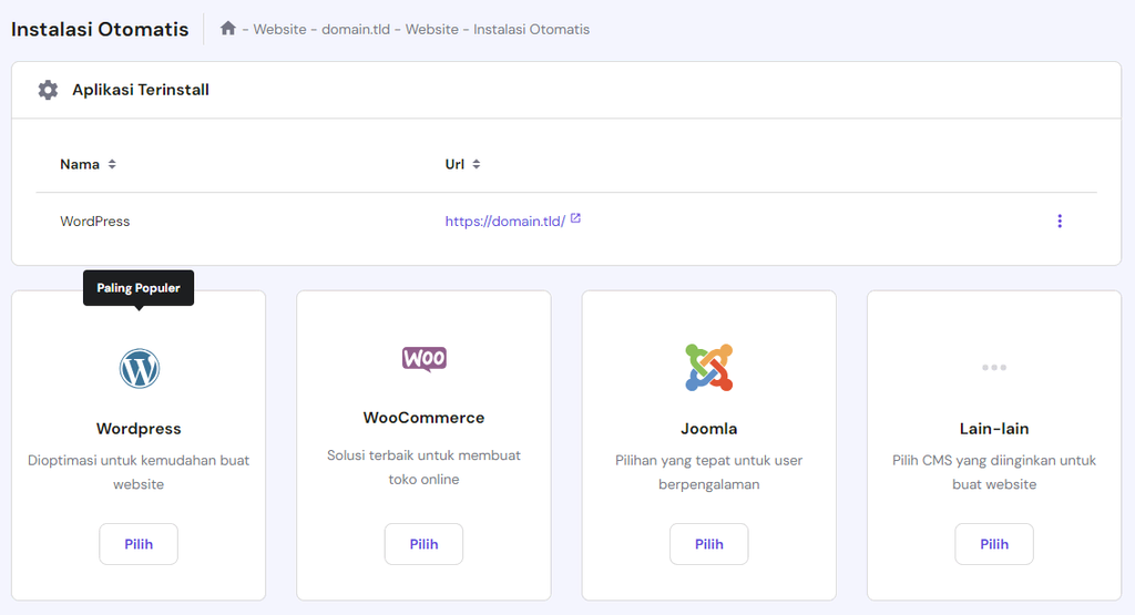 Di Hostinger, Anda bisa menginstal ulang WordPress melalui hPanel dengan Instalasi Otomatis di menu pengelolaan website. Cara ini sangat berguna kalau Anda sudah tidak bisa mengakses dashboard WordPress yang kena hack.
