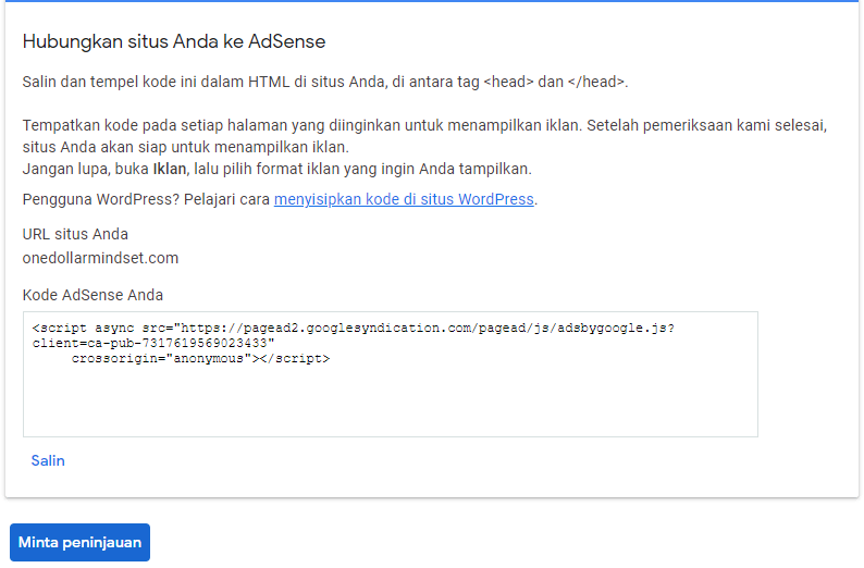 - Kembali ke halaman AdSense, kemudian klik Minta peninjauan.